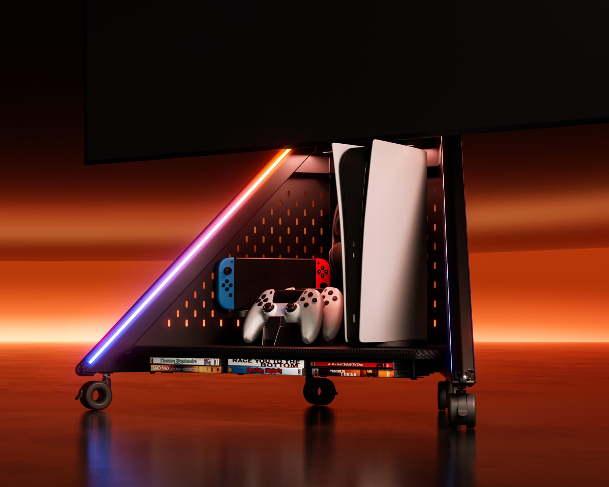 Beaucoup ont rêvé d’une véritable salle de gaming. Le quotidien les a fait patienter.Ce support TV pour gaming a été conçu pour les modes de vie et les intérieurs modernes. Il vous permet de passer facilement d’un moment de détente à une session de jeu, dans un seul et même espace.