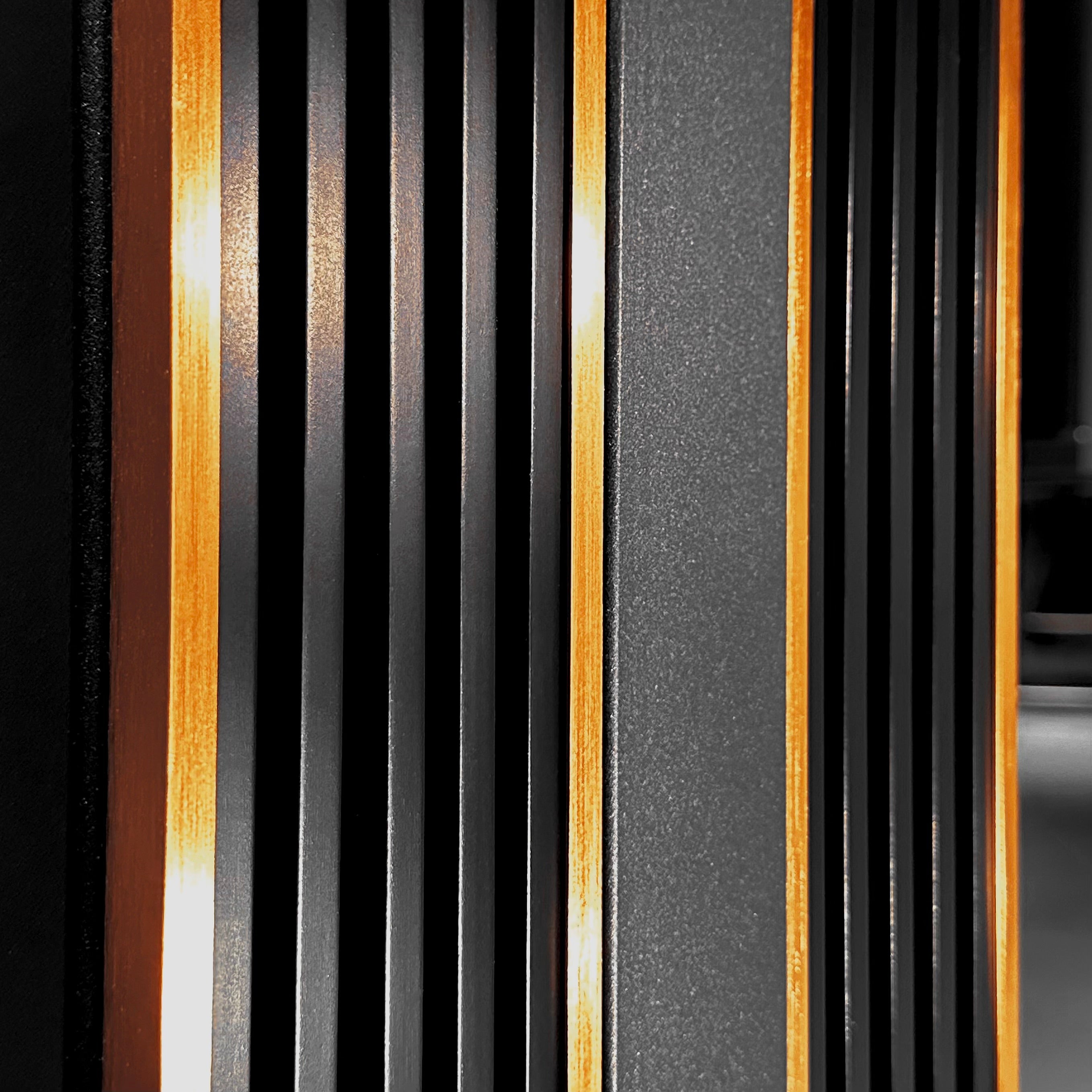 "La griglia in legno massello, elegante e in piedi, è realizzata in faggio di cuore. Il gioco di luci e ombre emana un'eleganza senza tempo e sottolinea la qualità del mobile."